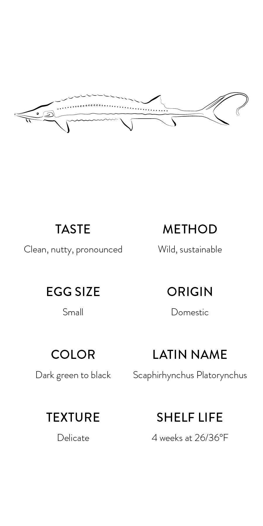 This wild large fish from the Mississippi River is perfect for a caviar introduction. A good alternative to the more expensive Osetra caviar.